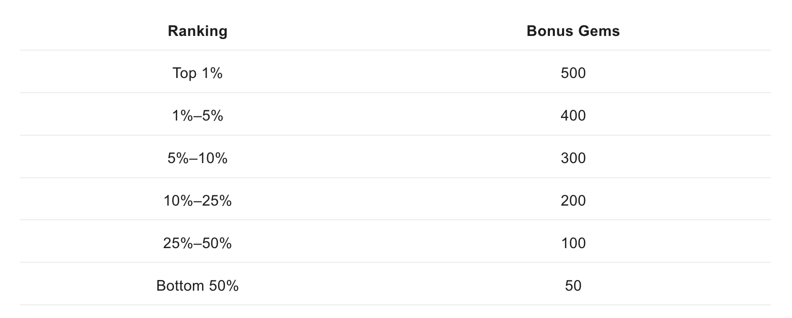 - Weekly Leaderboard Rewards. Earn immediate Gem bonuses every Sunday.