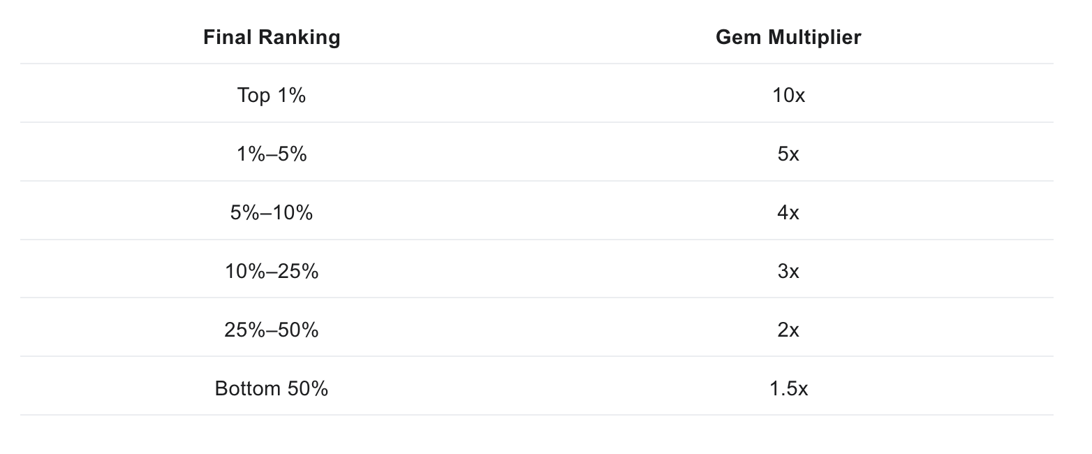 - Final Ranking Multipliers. At the end of the Invitational, your total committed Gems get multiplied up to 10x based on your final position.