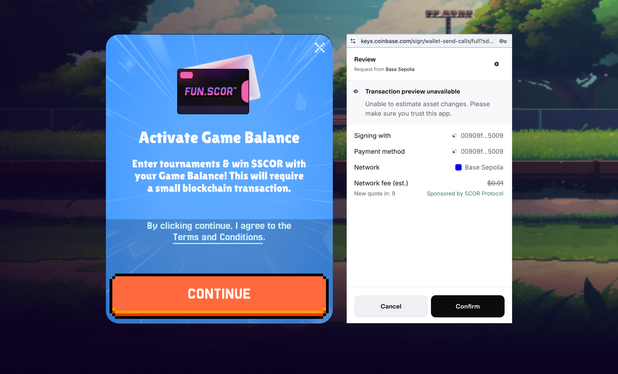 - Free if you’re using Base Wallet (Scor is covering the gas fees for you)