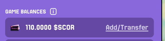 To use $SCOR in head-to-head tournaments and other competitive modes, you’ll need to add $SCOR to your Game Balance. There are two ways to fund it, both available by clicking Add/Transfer next to your $SCOR Game Balance.