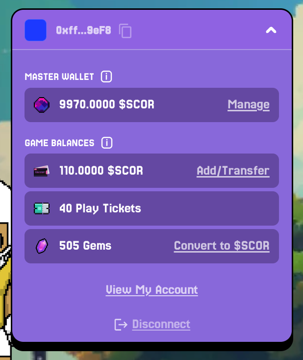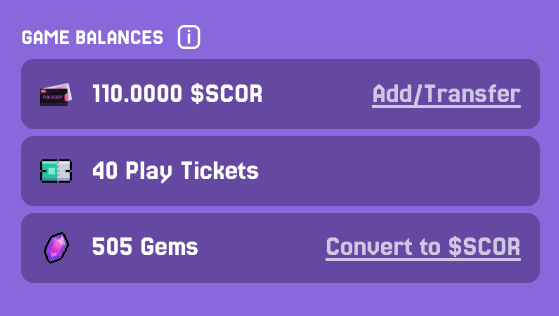 - Game Balances – the $SCOR, Gem and Ticket balances available for use in games